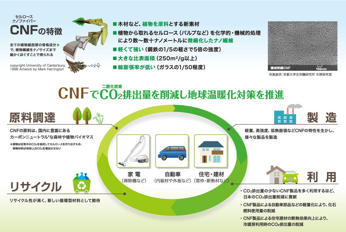 木材から化学的・機械的処理により取り出したナノサイズの繊維状物質で、軽さ、強度、耐膨張性など様々な点で、環境負荷が少なく、既に自動車、家電、住宅・建材などへ活用され、また普及を期待されています。