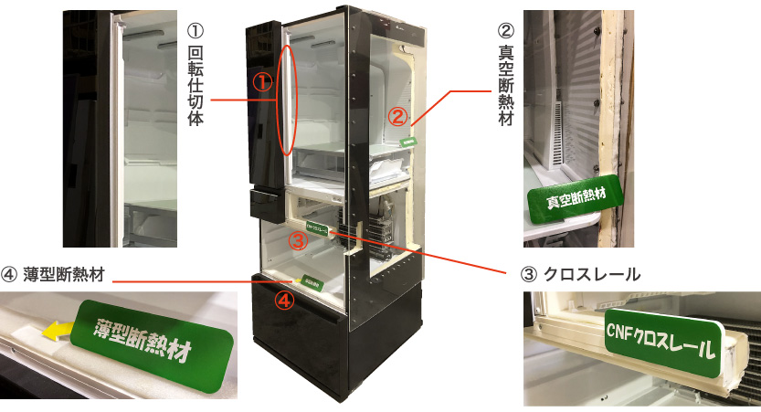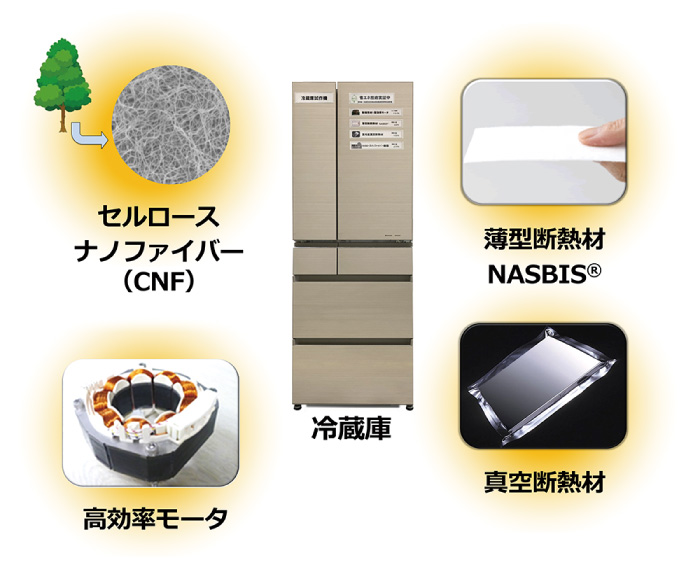 CNFを製造するときに排出されるCO₂の削減、さらには、電気製品の消費電力削減に向けた植物由来材料の家電製品への適用および金属のCNF樹脂置き換えによる断熱性能向上を狙いとして検討を行いました。